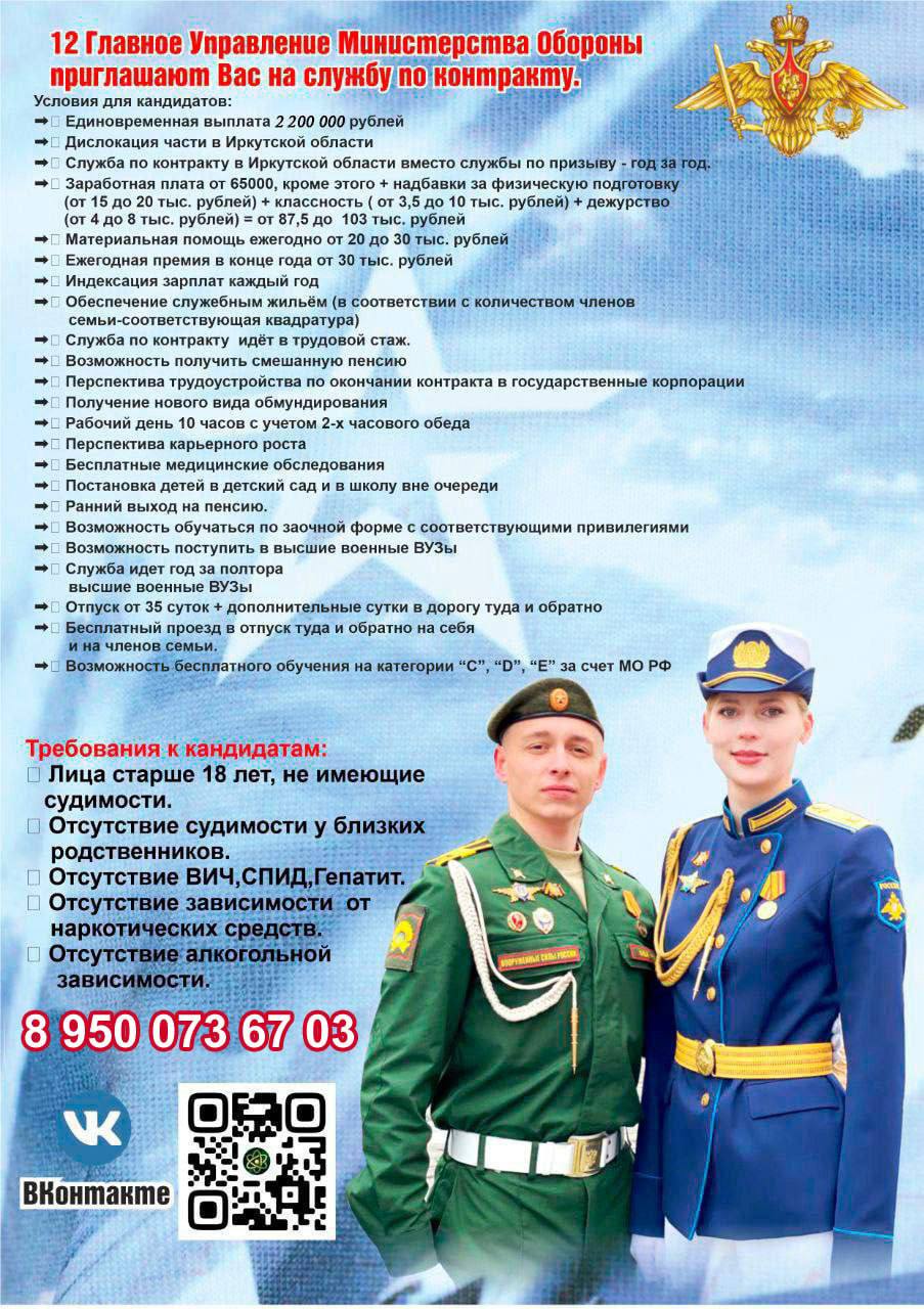 Главная → Объявления → Объявление: 12 Главное управление Министерства оборону по Иркутской области приглашают Вас на службу по контракту